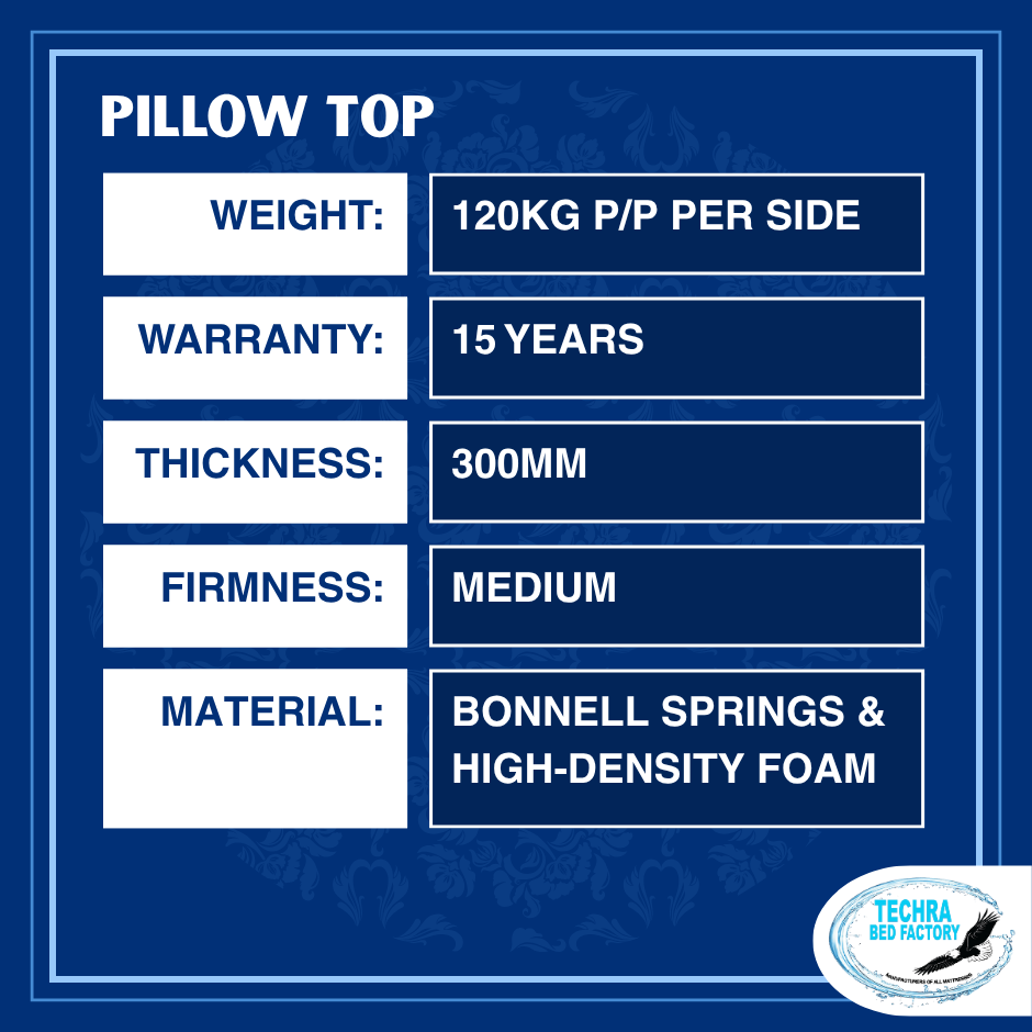 The Pillow Top mattress is 300mm thick, can take up to 120kg p/p per side, and has a 15 year warranty.