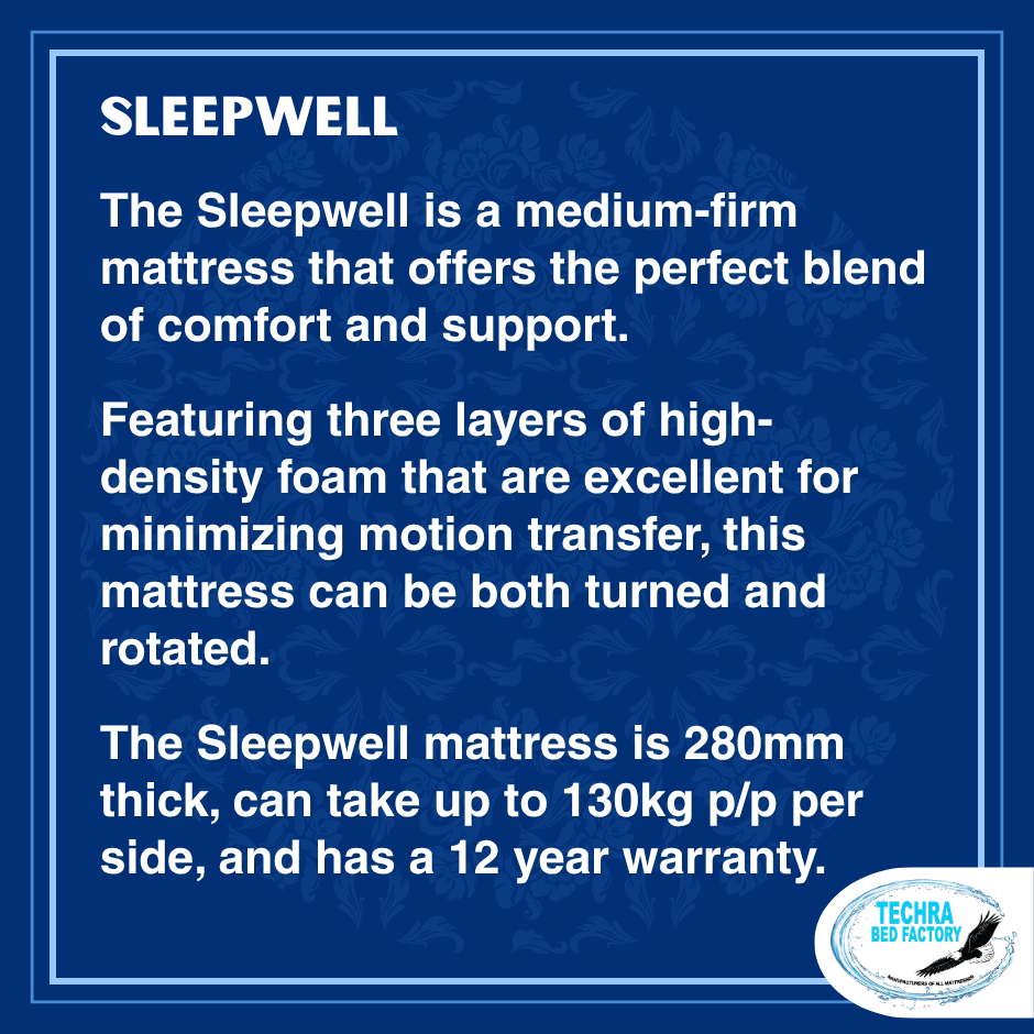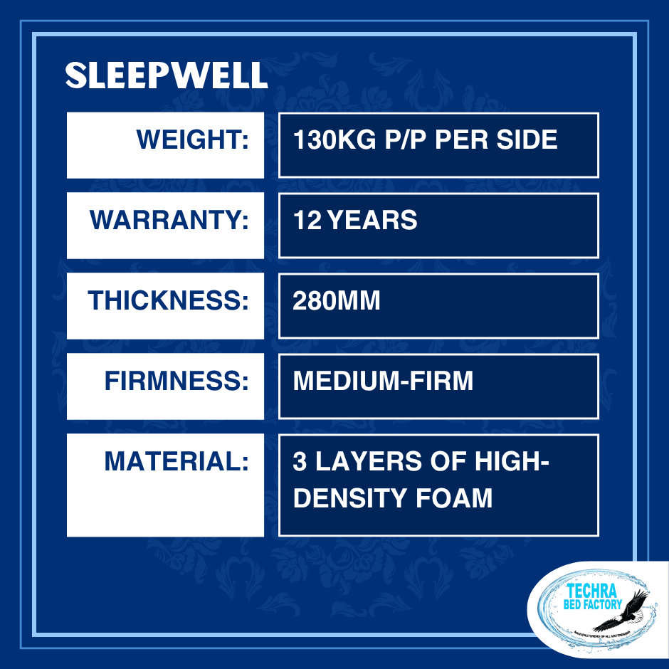 The Sleepwell mattress is 280mm thick, can take up to 130kg p/p per side, and has a 12 year warranty.